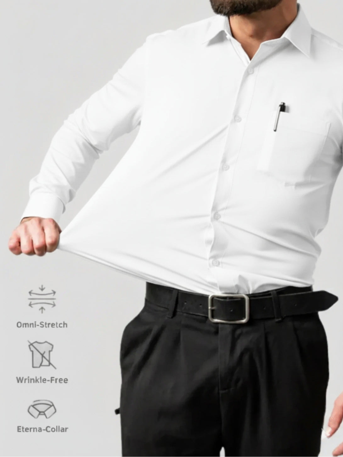 Made for busy men. This Non-Iron Front Pocket 4-Way Stretch Dress Shirt keeps you sharp with zero effort. It moves with you, stays smooth all day, and feels comfortable on the belly and shoulders. The front pocket adds simple, everyday convenience. Easy to wear, easy to care for the shirt you’ll use all the time.
