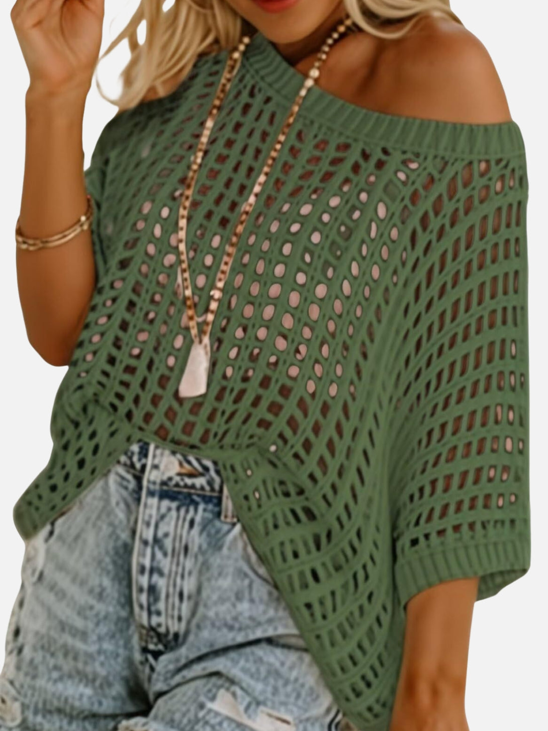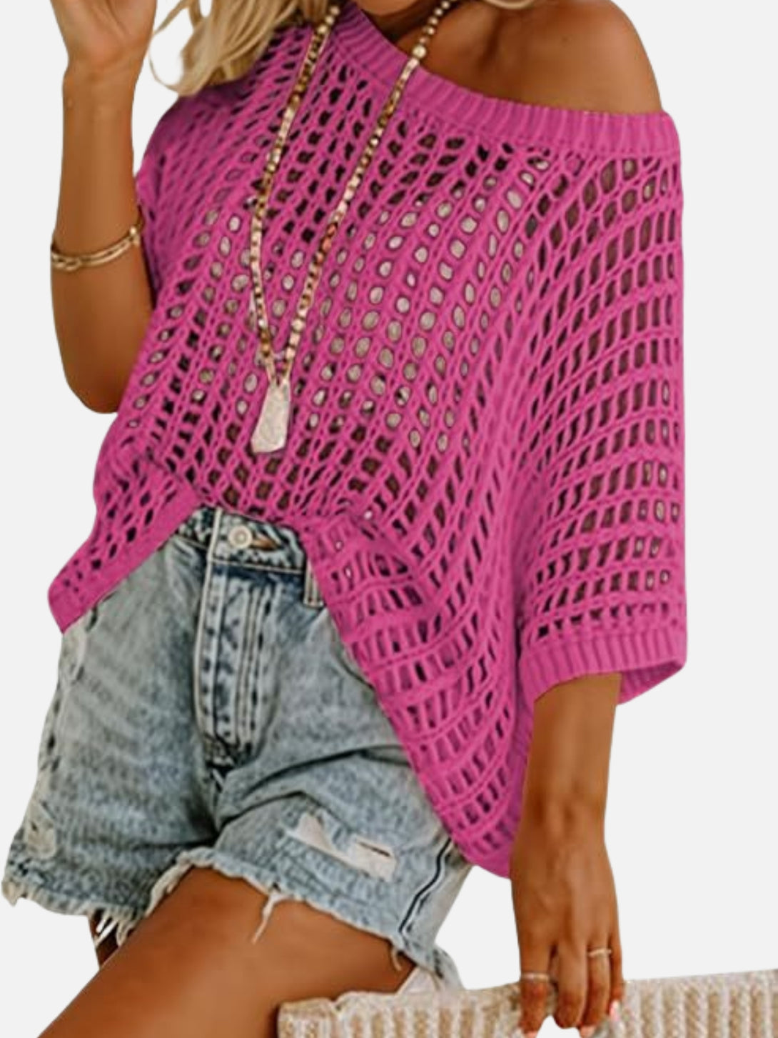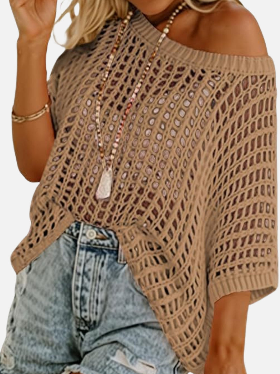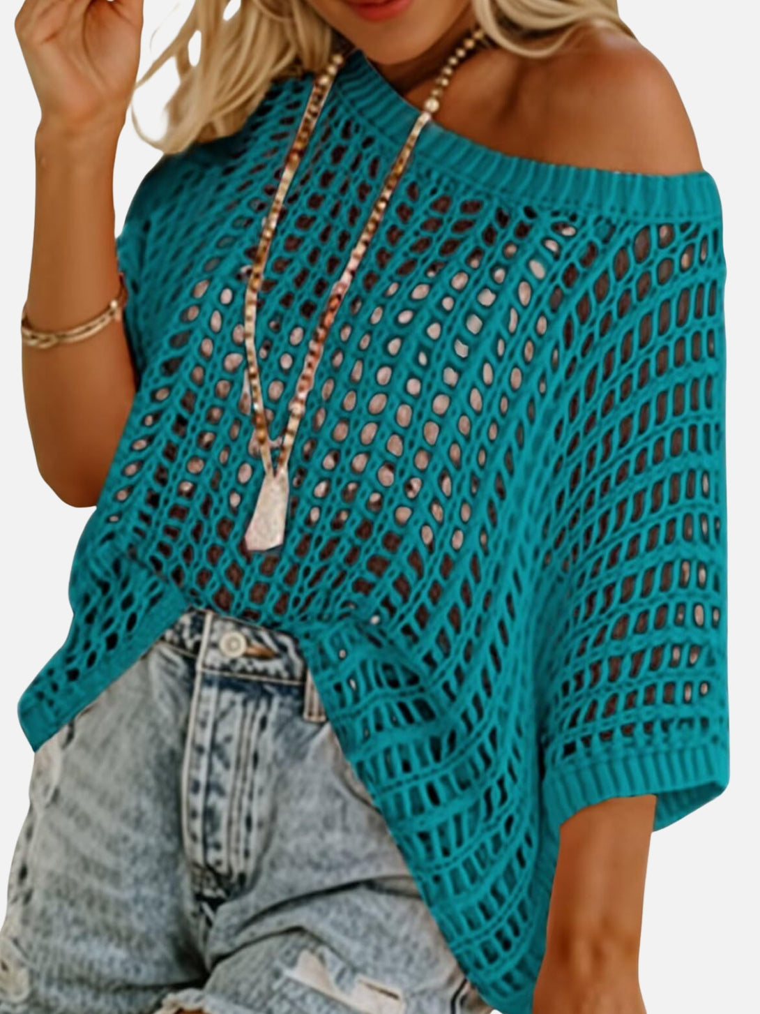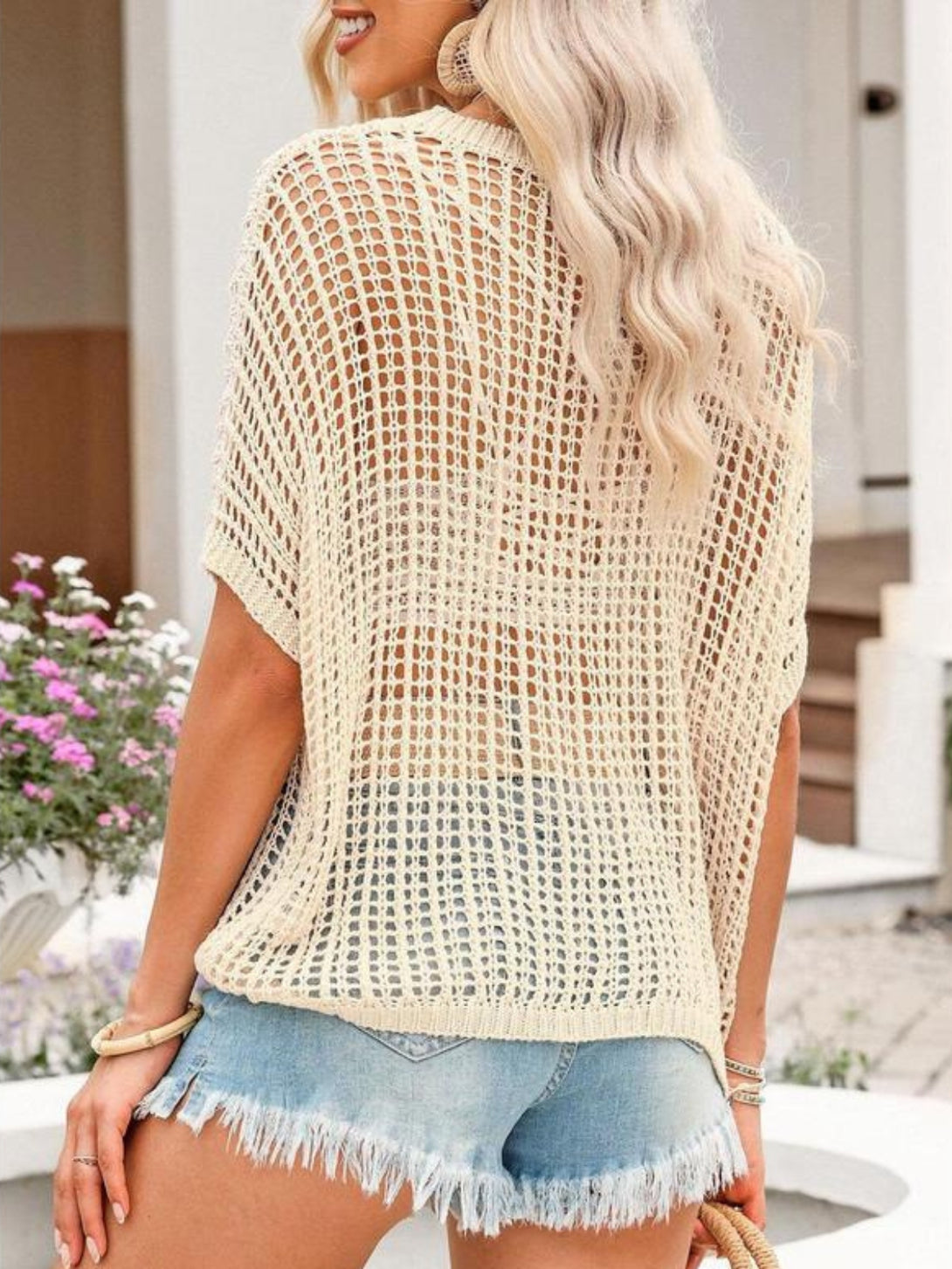 Fit: Loose fit, wave collar, half sleeves, hollow knit texture, hip-length cut with hooded neckline