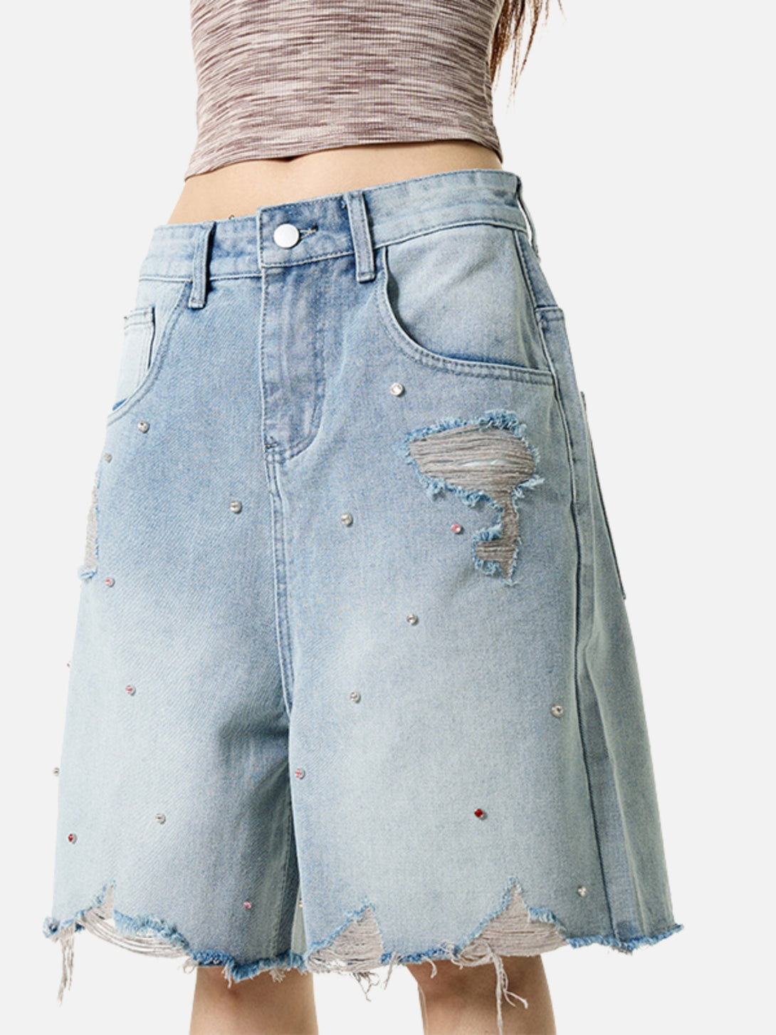 RetroShine Rhinestone Wide‑Leg Denim Shorts