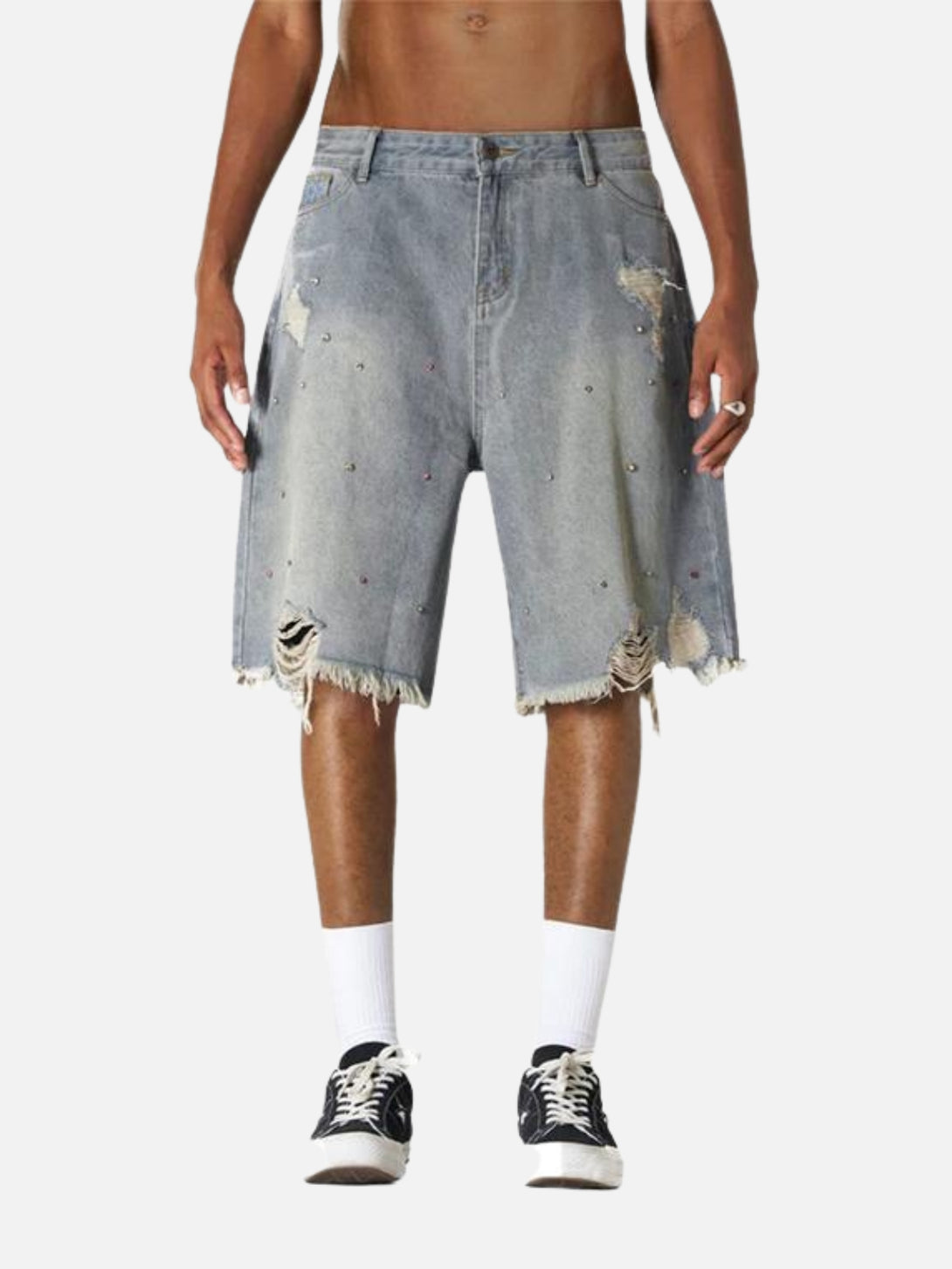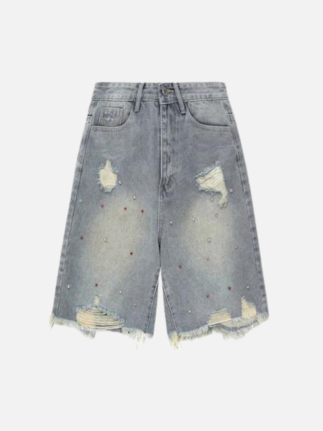 Step into the spotlight with RetroShine Denim Shorts — featuring a ripped, faded wide-leg cut that pays homage to ‘90s style, topped with playful rhinestone detail for that extra pop.
