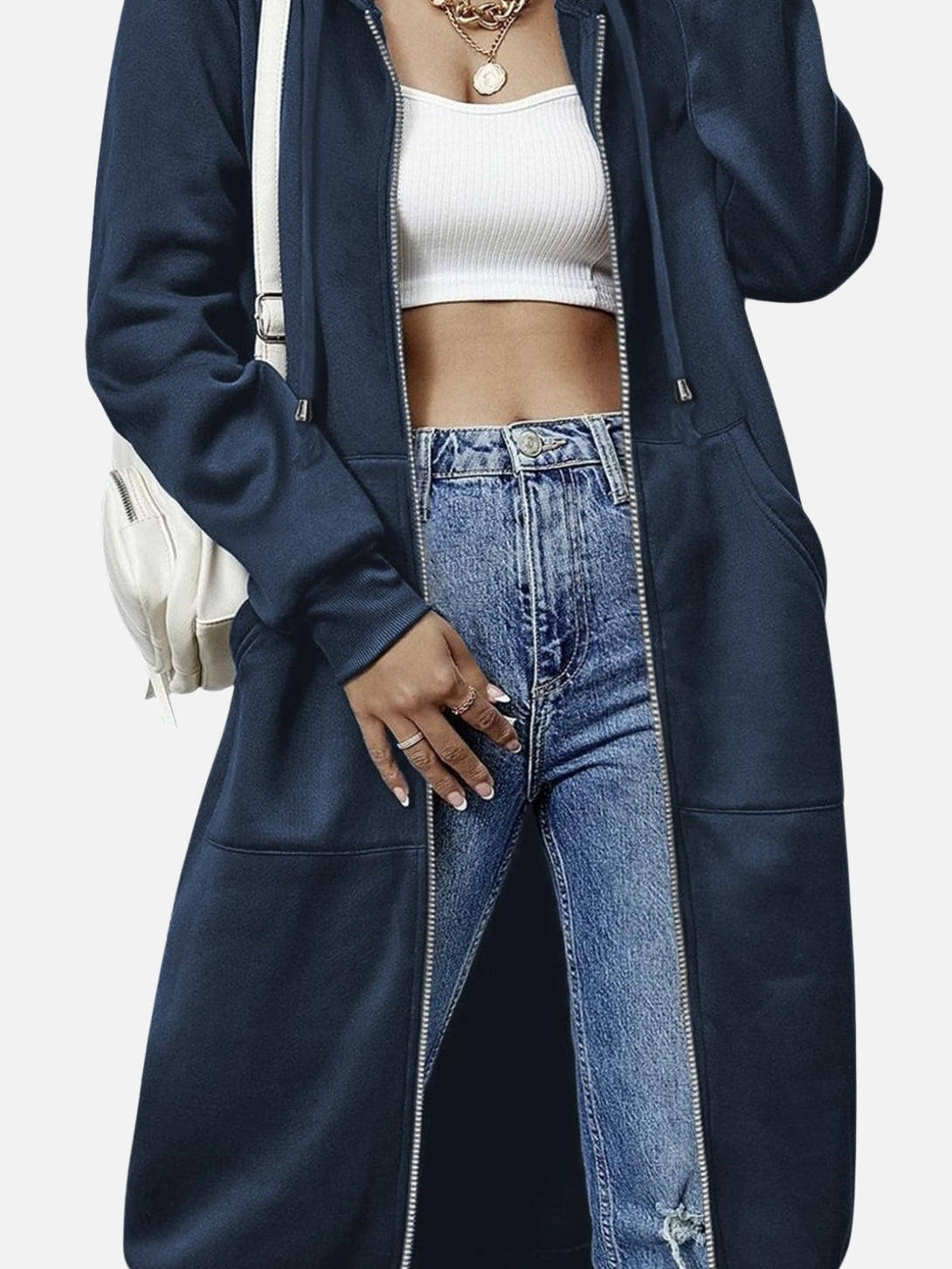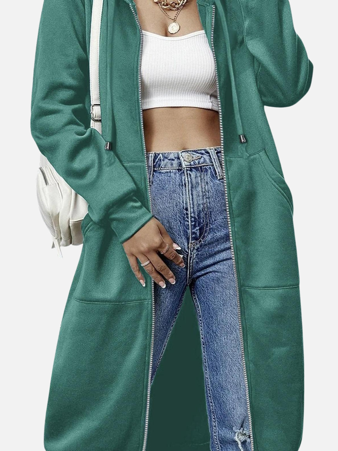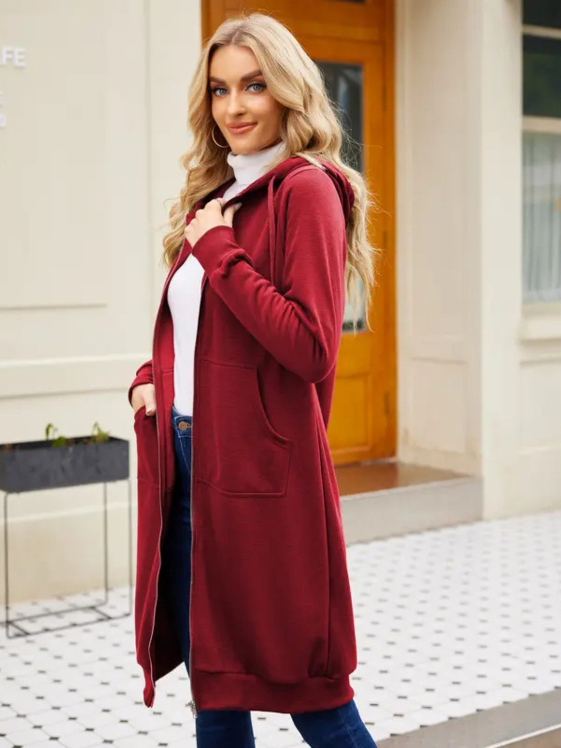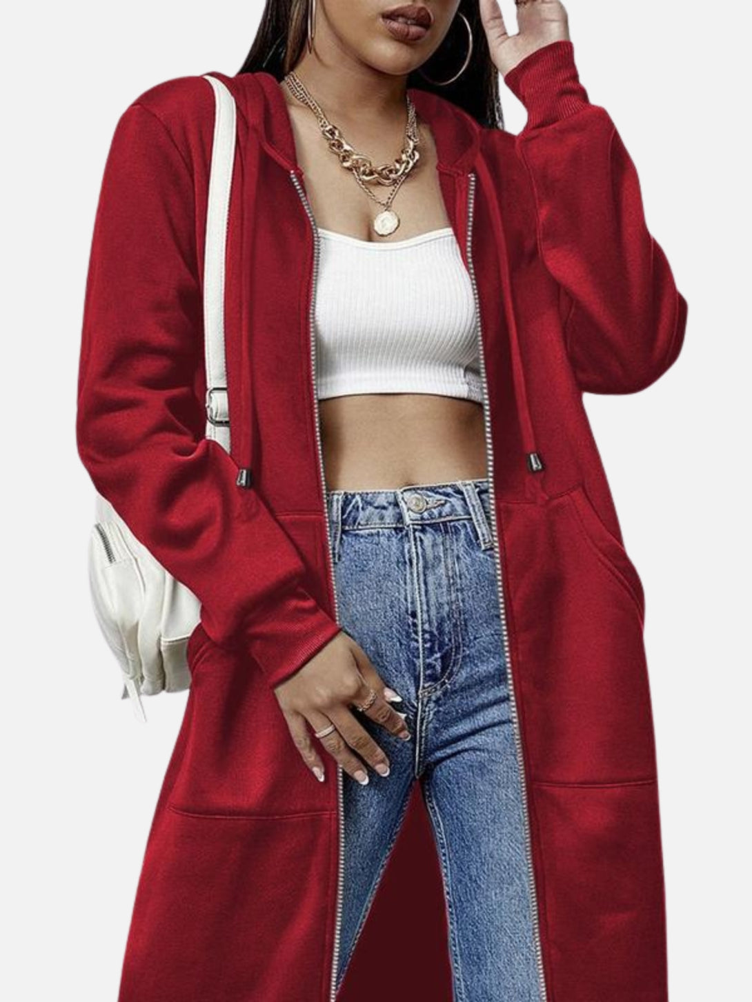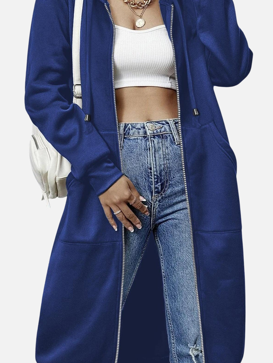 Designed with a flattering longline fit, polo collar, and princess-cut sleeves, this zip-up brings cozy vibes and subtle polish to your everyday look. The drawstring hood adds an extra edge, while bold tones make every outfit pop.