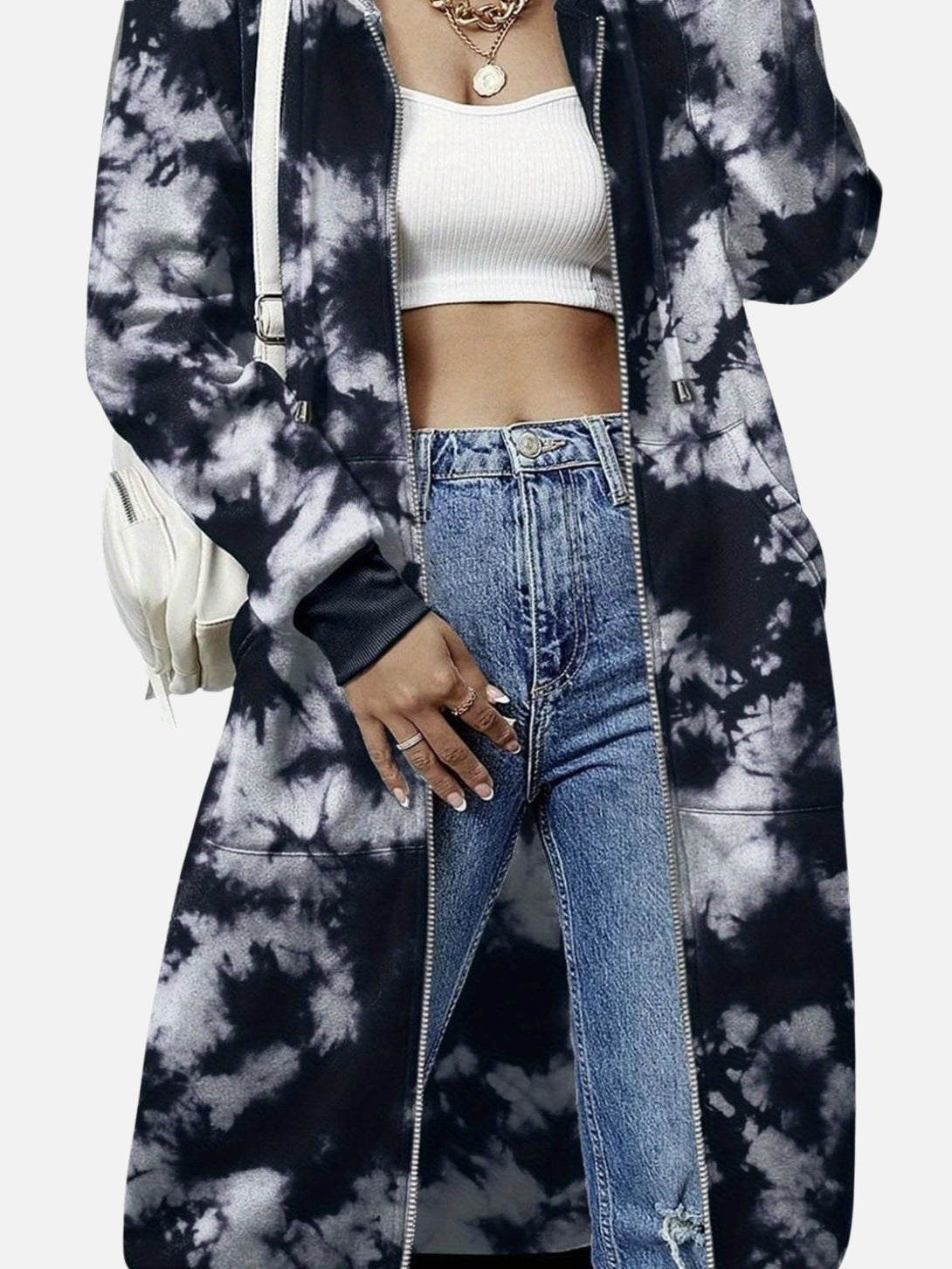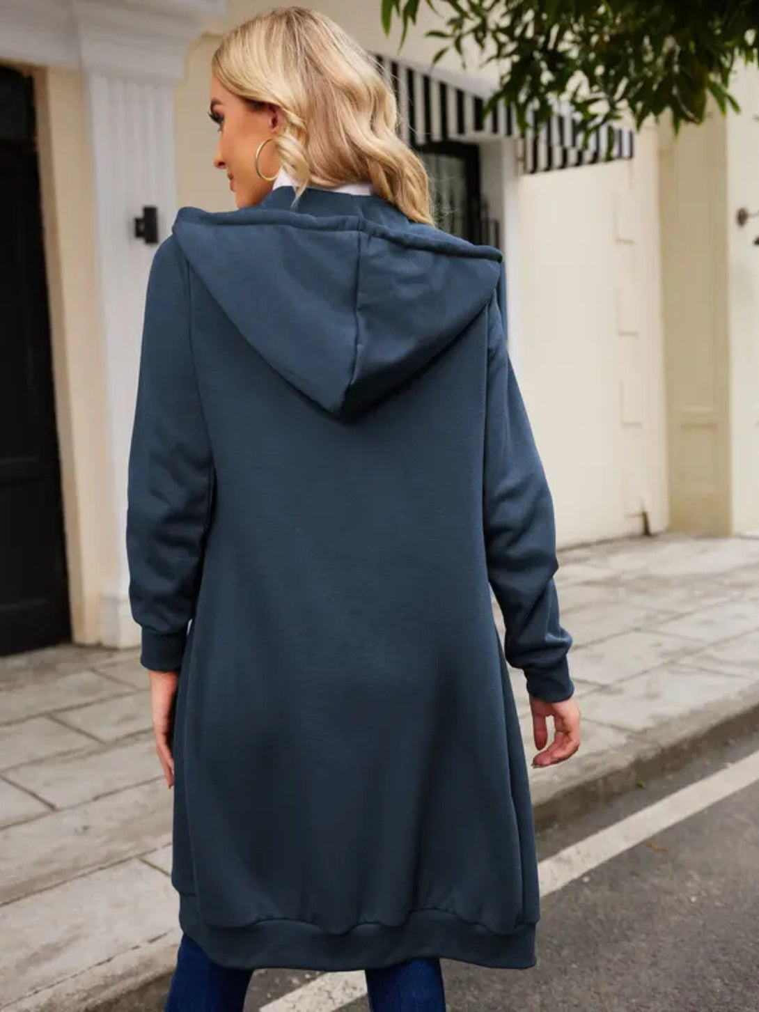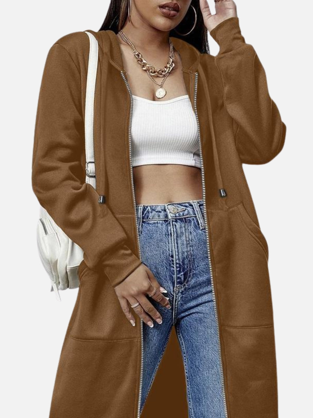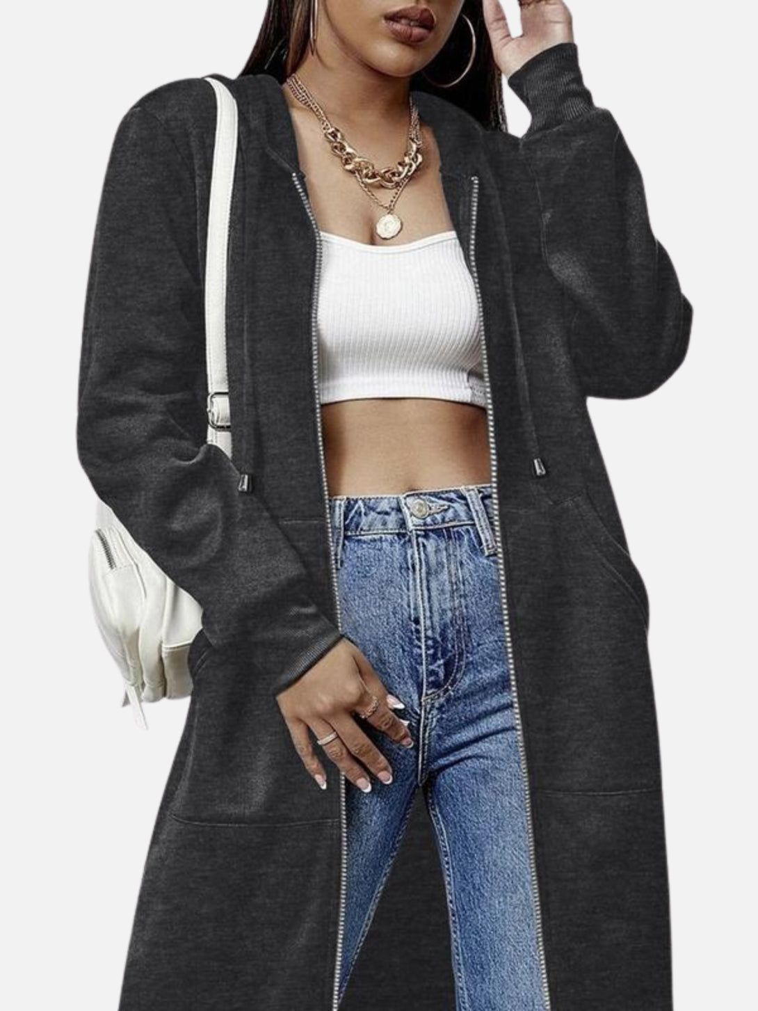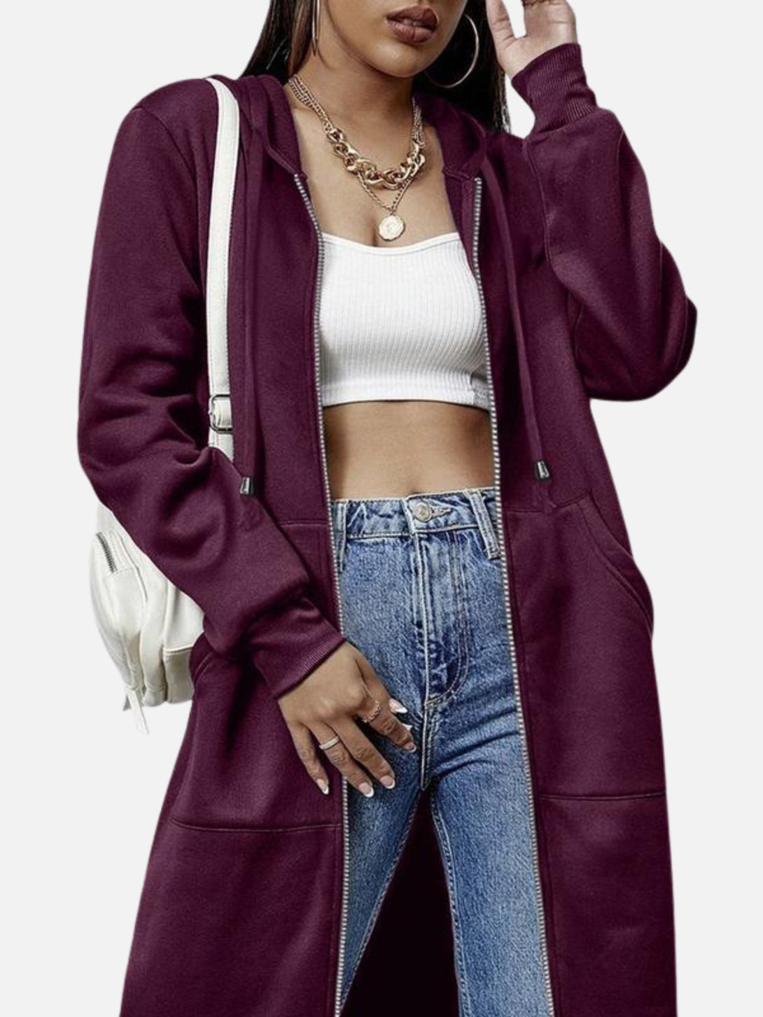 Designed with a flattering longline fit, polo collar, and princess-cut sleeves, this zip-up brings cozy vibes and subtle polish to your everyday look. The drawstring hood adds an extra edge, while bold tones make every outfit pop.